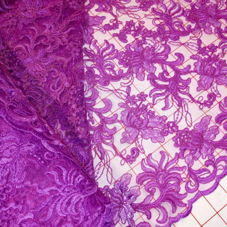 Pizzo rebrodato su rete, in diversi colori, altezza 120 cm.